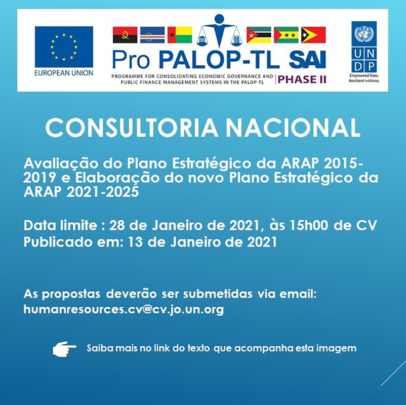 No quadro do projeto Programa para a Consolidação da Governação Económica e Sistemas de Gestão das Finanças Públicas nos PALOP e Timor Leste (Pro PALOP-TL ISC (FASE II)), o Escritório Comum do PNUD, UNFPA e UNICEF em Cabo Verde, através do presente anúncio, faz saber que se encontra aberto o concurso (consultoria nacional) destinado à: Avaliação do Plano Estratégico da ARAP 2015-2019 bem como elaboração do novo Plano Estratégico da ARAP 2021-2025- RFP/02/2021;