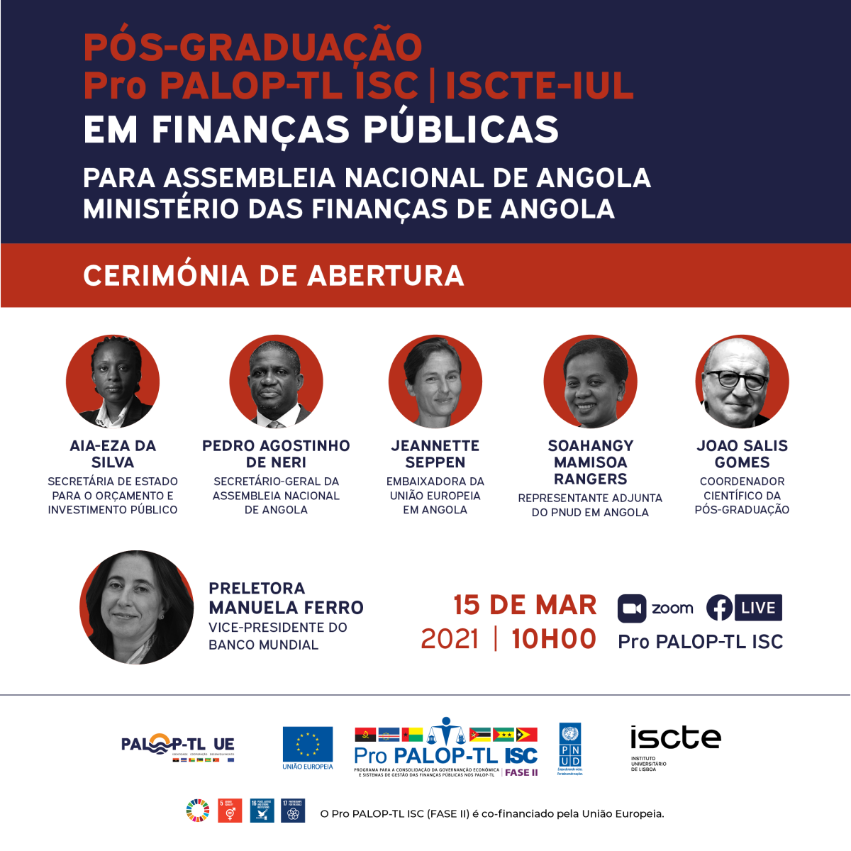 A sessão de abertura do curso de Pós-Graduação em Finanças Públicas destinado a 60 quadros oriundos da Assembleia Nacional e Ministério das Finanças de Angola terá lugar no dia 15 de março de 2021, às 10H00 de Angola, na plataforma Zoom, com transmissão direta no Facebook do Pro PALOP-TLISC.