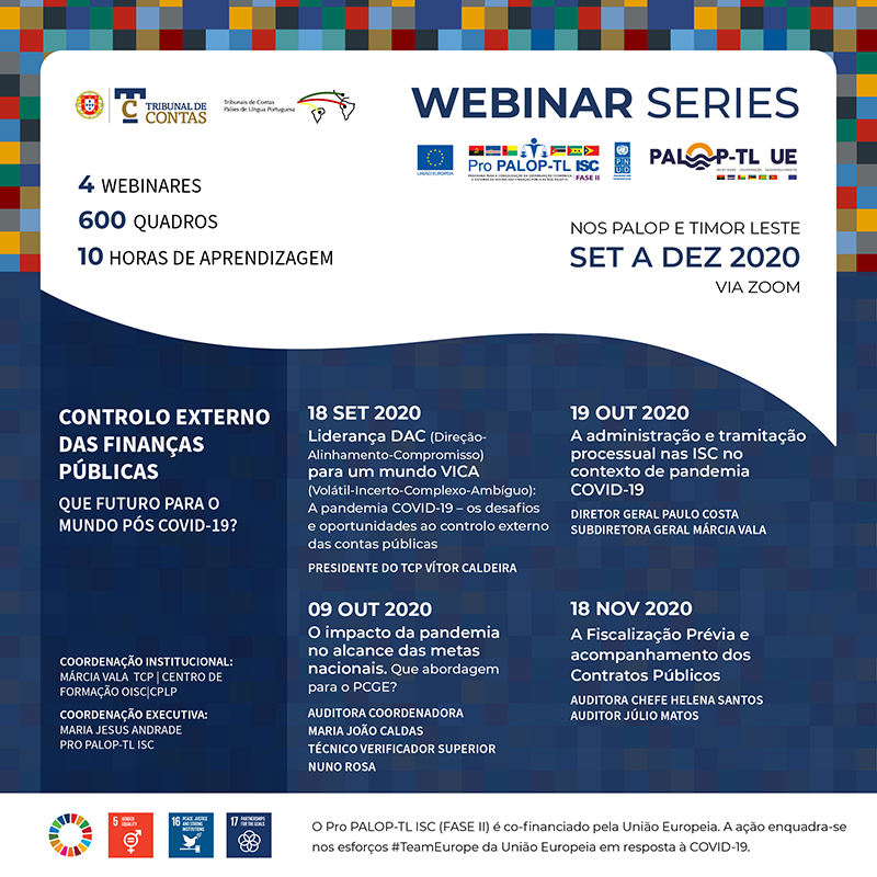 Como fazer o “Controlo Externo das Finanças Públicas - Que Futuro para o Mundo Pós COVID-19?” é o tema central do ciclo de webinares desenvolvido pelo Pro PALOP TL ISC em parceria Tribunal de Contas de Portugal. Fiscalizar as contas públicas assume ainda maior importância no momento de menores recursos e do contexto difícil e atípico provocado pela pandemia COVID19.