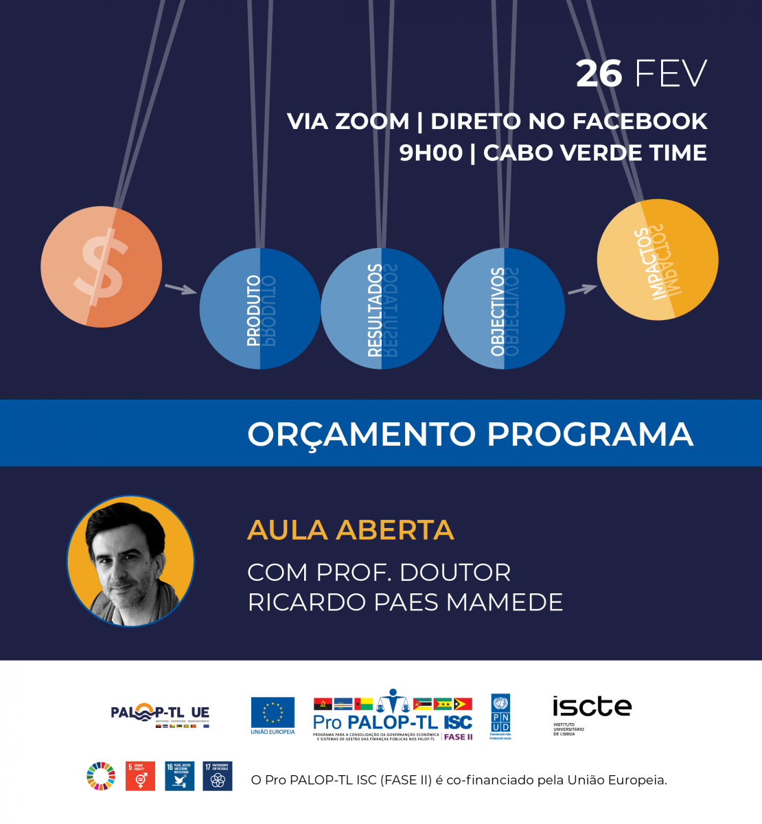 O Pro PALOP-TL ISC, em parceria com o Iscte-IUL/IPPS, organizam no dia 26 de fevereiro, a Aula Aberta sobre Orçamento-Programa, com o Prof. Doutor Ricardo Paes Mamede. A aula irá decorrer no Zoom com tradução simultânea PT/ING e será transmitida em direto no Facebook do Pro PALOP-TL ISC a partir das 09H00 de Cabo Verde e correspondentes fusos horários dos restantes PALOP e Timor-Leste.