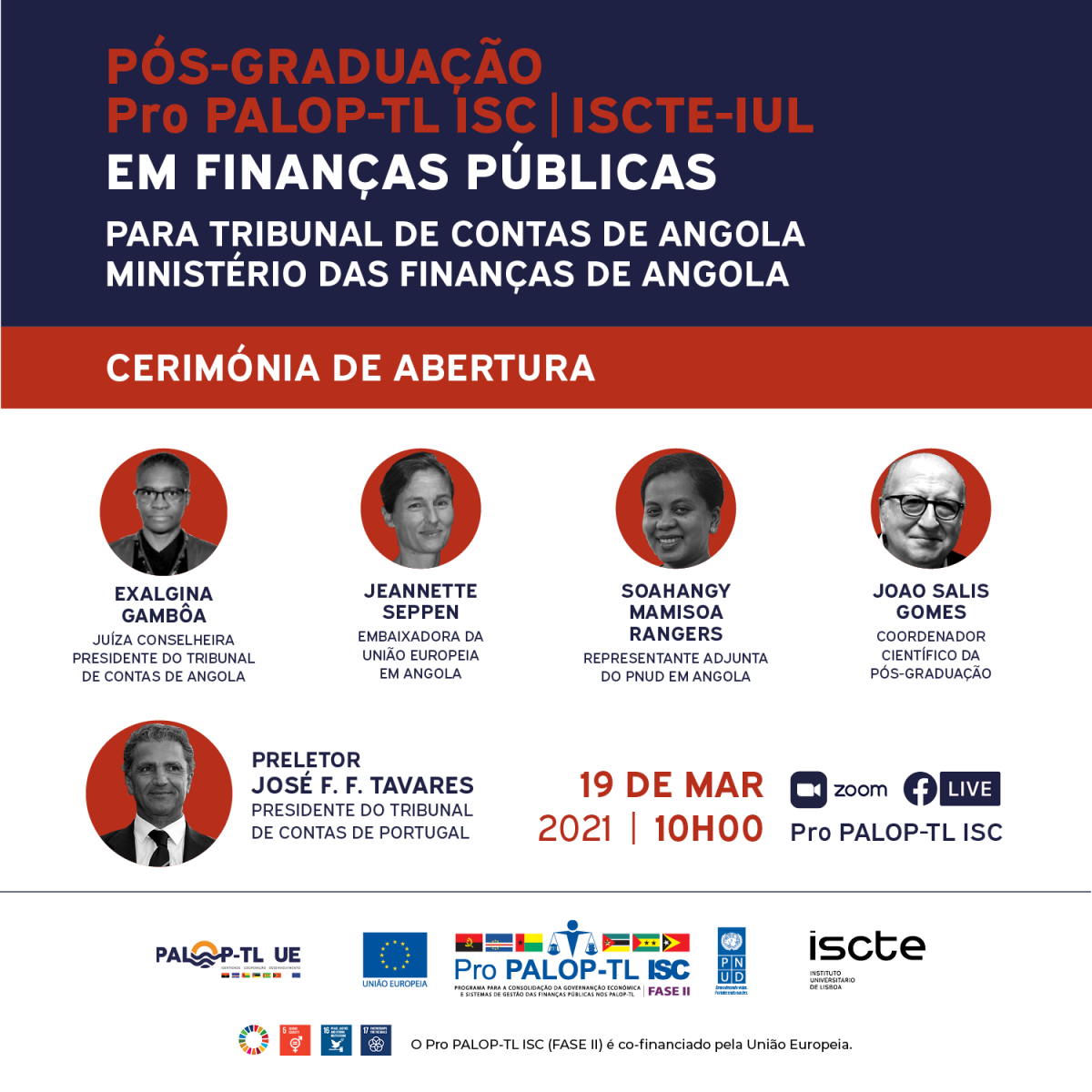 A segunda turma do curso de Pós-Graduação em Finanças Públicas em Angola terá um total de 63 alunos, dos quais 47 quadros do Tribunal de Contas, incluindo Juízes Conselheiros, Auditores seniores e quadros técnicos superiores, aos que se somam mais 16 quadros superiores do Ministério das Finanças. A cerimónia de acolhimento virtual aos estudantes terá lugar no dia 19 de março de 2021, às 10H00 de Angola, com transmissão direta no Facebook do Pro PALOP-TL ISC.