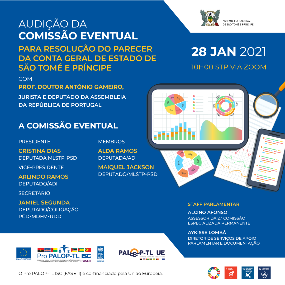 Assembleia Nacional de São Tomé e Príncipe irá realizar, no dia 28 de janeiro, a primeira audição da Comissão Eventual instituída em 2020 para Análise das Contas Gerais do Estado Pendentes, conforme definido no Plano Estratégico desta instituição, resultado do apoio técnico Pro PALOP-TL ISC.
